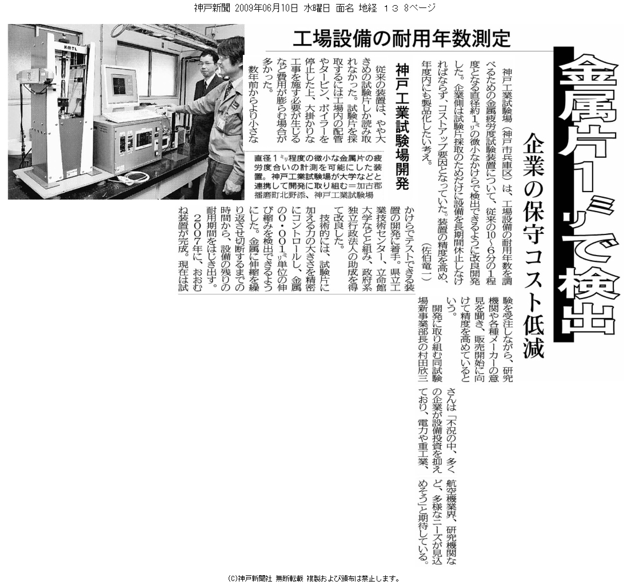神戸新聞に”金属片1ミリで検出 企業の保守コスト低減”として、当社が開発した微小疲労試験機の記事が掲載されました。