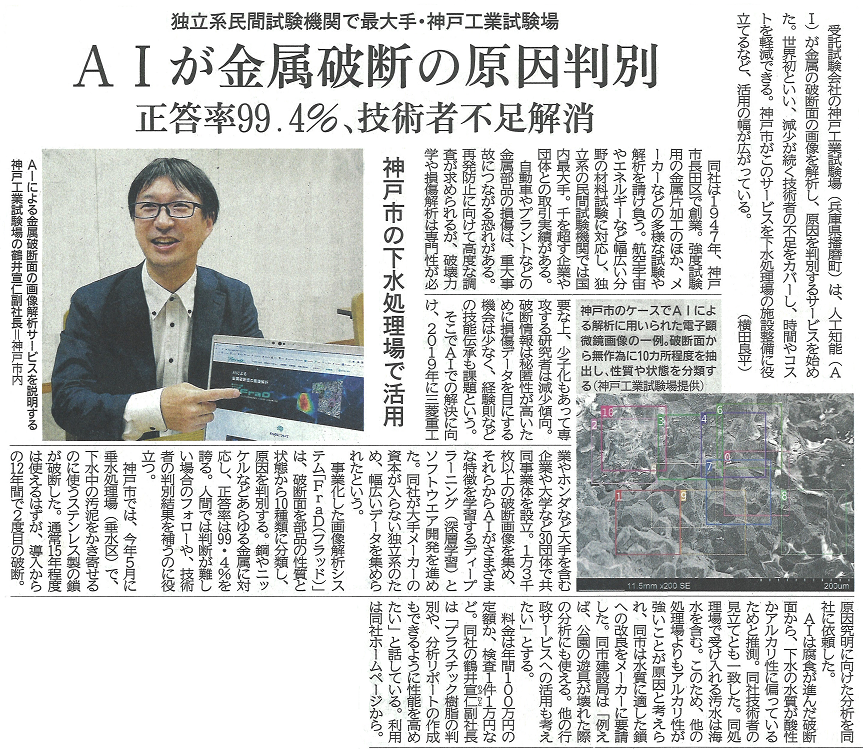 神戸新聞2023年11月18日号8面にて、AIによる金属破断面画像解析「FraD」に関する記事が紹介されました。